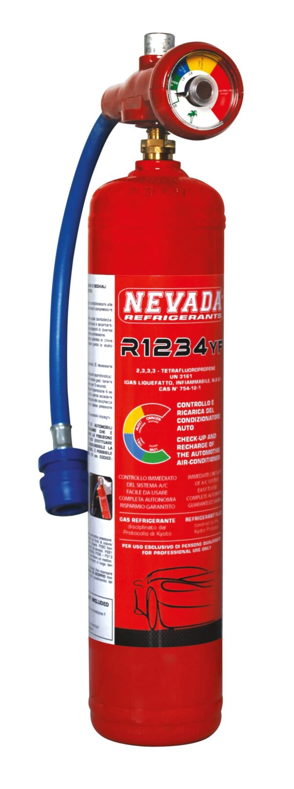 Gas refrigerante R1234yf in bombola da 700 grammi con valvola 1/2″ ACME SINISTRO per diagnosi e ricarica di impianti a/c auto. Bombola a norma T-PED / EN 13322-1, dotata di manometro con tubo e attacco rapido che permette di eseguire le ricariche senza bisogno di altre apparecchiature. Ricarica self  UN 3161