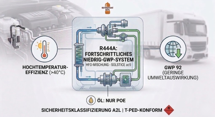 Wählen Sie Spitzentechnologie mit 5KG R444A (SOLSTICE ac5), vertrieben von Refrigerant Boys. Dieses HFO-Gas der nächsten Generation ist die ideale Lösung zur Maximierung der Effizienz von Klimaanlagen unter extremen Bedingungen. Mit einem GWP von nur 92 ist es der fortschrittliche Ersatz für R134a und R1234yf und bietet überlegene thermische Leistung und optimierte Kompatibilität. R444A ist mischbar und von den führenden Herstellern von Autoladestationen, einschließlich Texa, zugelassen. Dies gewährleistet Zuverlässigkeit und Vielseitigkeit für Werkstätten, den landwirtschaftlichen Sektor und Kühltransporte. Garantierte Füllung, zertifizierte Reinheit, nur von Refrigerant Boys.